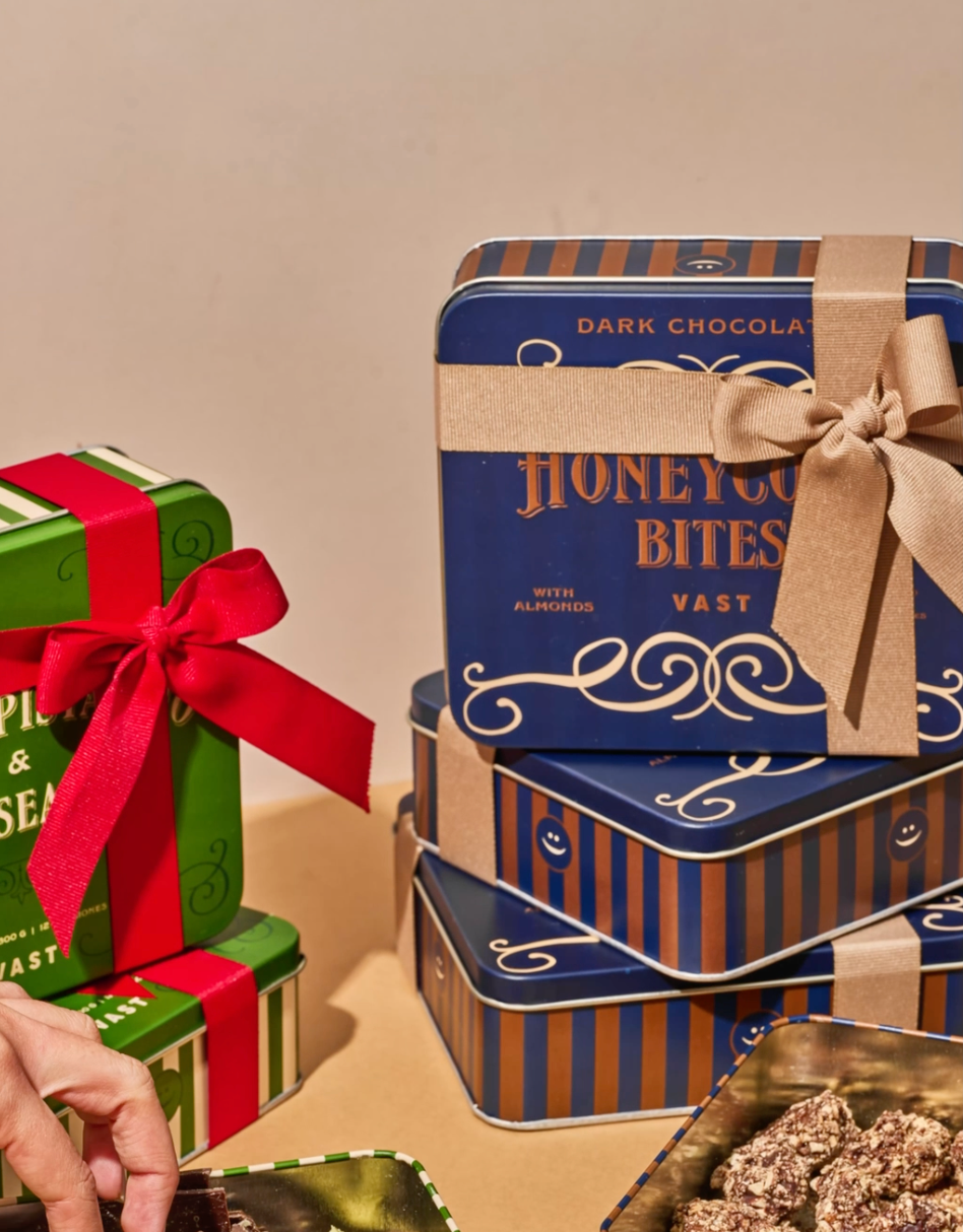 ~ Pedazos de miel crocante recubiertos en chocolate oscuro y trozos de almendra.