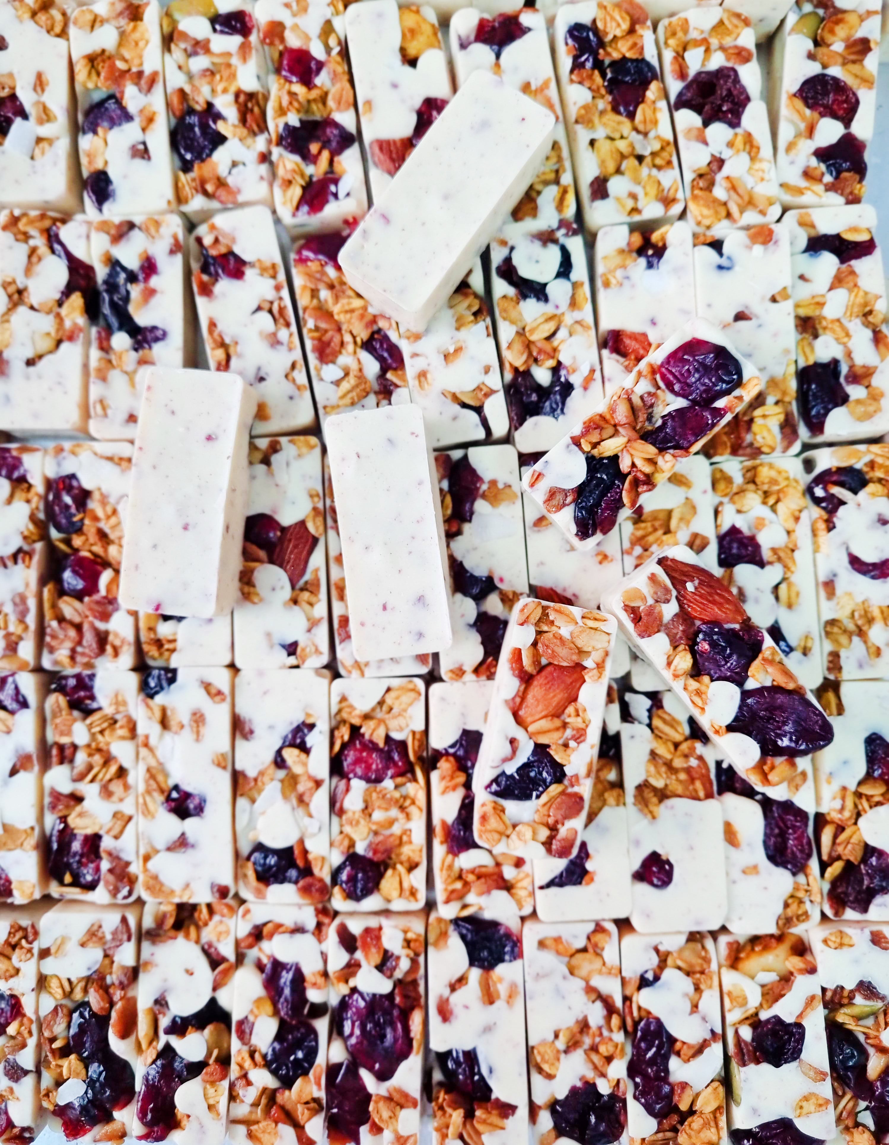 Barritas de yogurt y chocolate blanco con granola y frutos rojos.