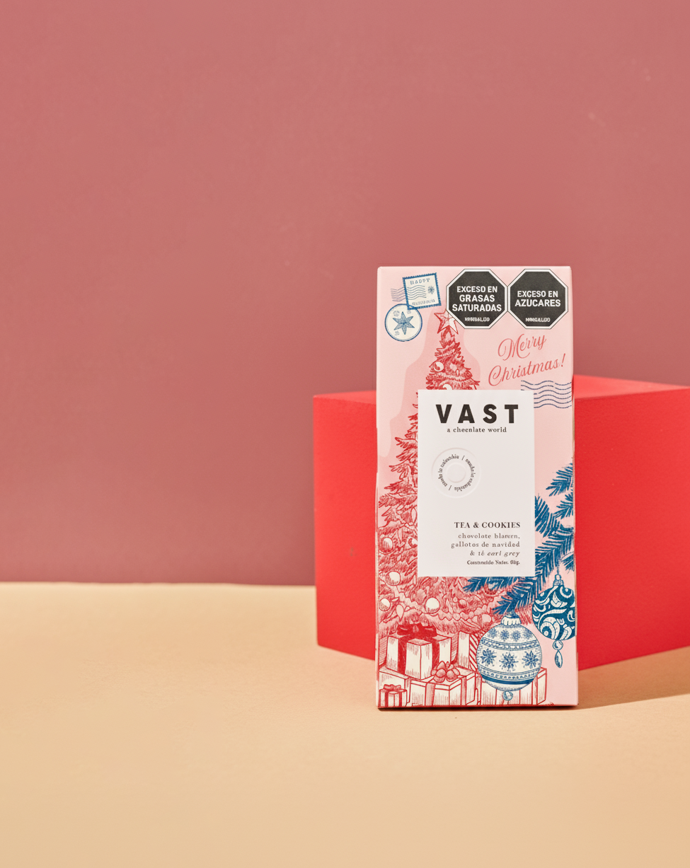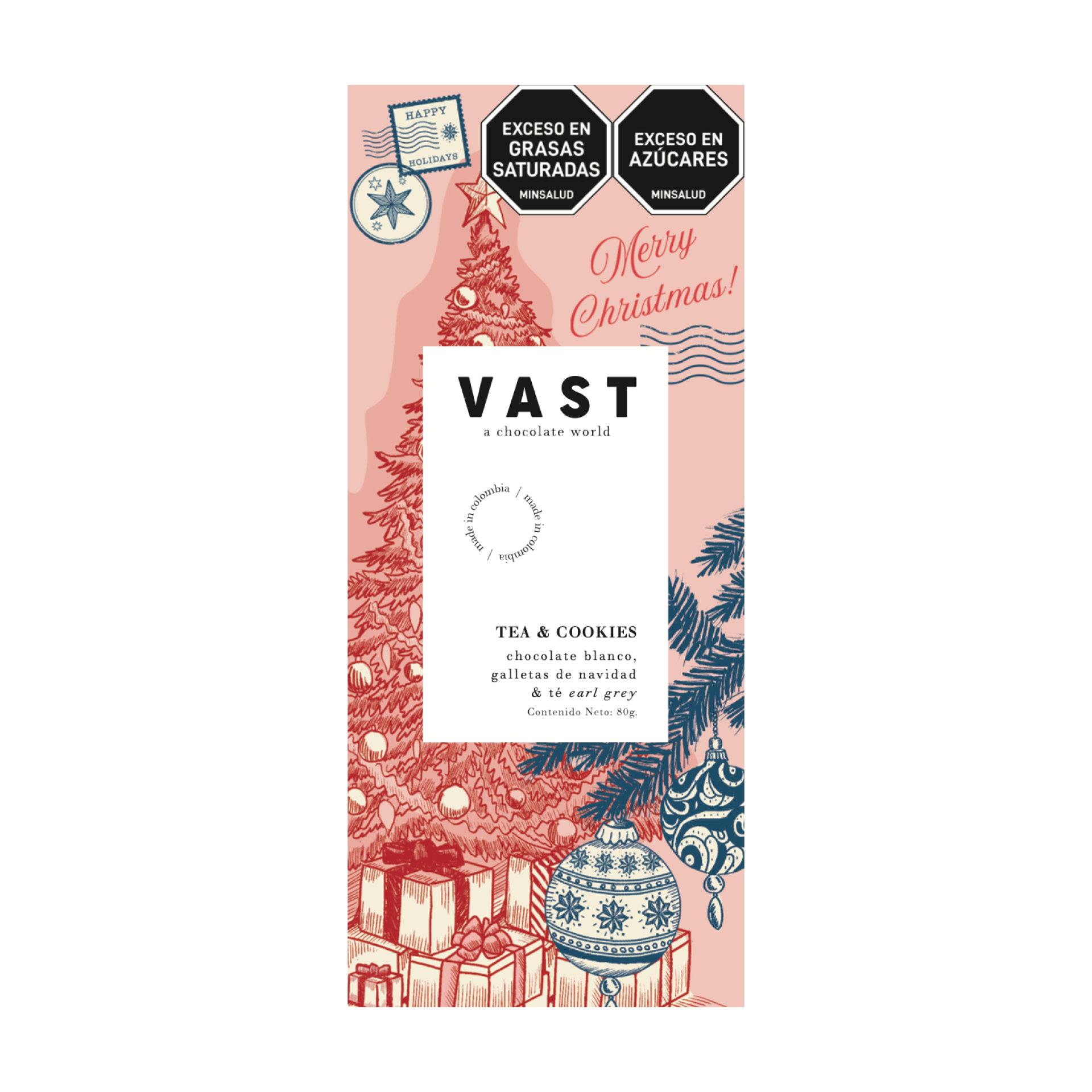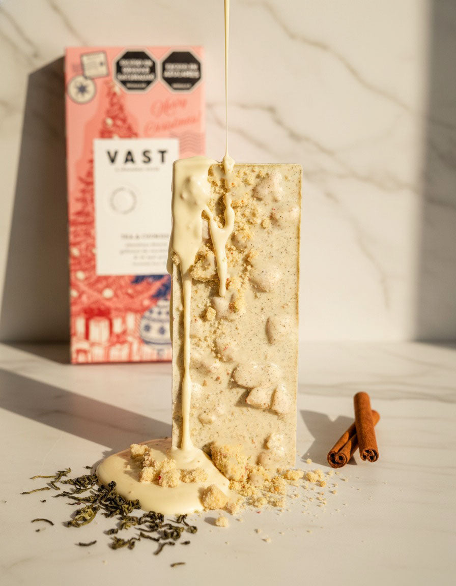 Chocolate blanco con trocitos de galletas de Navidad y un delicado aroma a té.